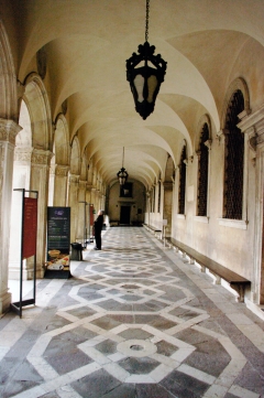 А начинается история Дворца дожей вместе с историей Венеции. Сооружен был первый дворец в византийском стиле примерно на нынешнем месте в IX веке. Не раз горел, подвергся сильной перестройке в 12 веке. Располагался между Пьяцетой и Рива Дей Скьявони (канал, над которым сейчас вы видите Мост Вздохов). В 1301 году, когда окончательно укрепилась власть аристократии, власти стало тесновато и скучновато в старом византийском дворце и дож Градениго начал строительство нового, в готическом стиле. Старое здание просто бросили, и оно постепенно превратилось в груду развалин.